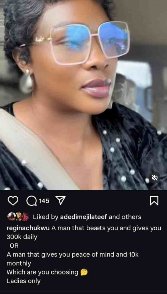 Taking to her Instagram page, she asked if they would prefer a boyfriend who gives them N300,000 daily but is abusive, or one who provides peace of mind but only N10,000 per month.