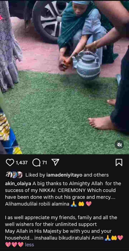 Akin Olaiya acknowledged that without Allah’s mercy and grace, the wedding would not have been possible, as he appreciated everyone who supported him during the memorable occasion.