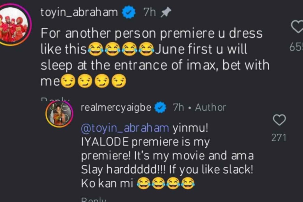 In the comment section, Toyin Abraham criticized Aigbe for going overboard with her outfit at someone else’s movie premiere. She jokingly warned the mother of two not to outdo herself at her own movie premiere in June, or she might end up sleeping at the entrance.