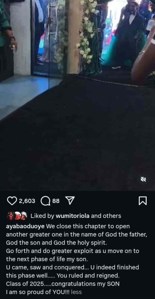 Nollywood actress Mosun Filani is in a celebratory mood as her son, Oluwashinayomi, graduates. Sharing a video from his graduation ceremony on her Instagram page, the proud mother offered heartfelt prayers, declaring that this milestone marks the end of one chapter and the beginning of a greater one.