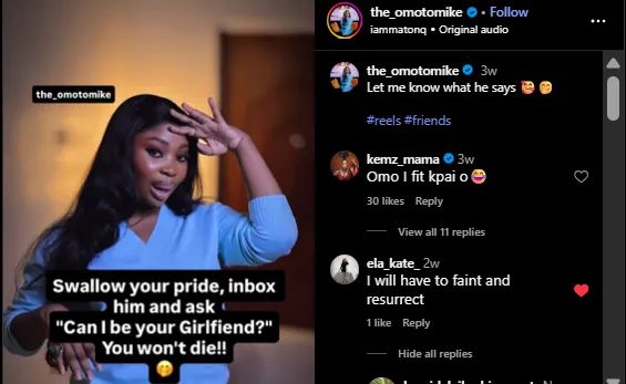 Influencer Omotomike accompanied the video with the caption; “Swallow your pride, inbox him and ask ‘Can I be your girlfriend?’ you won’t die”
