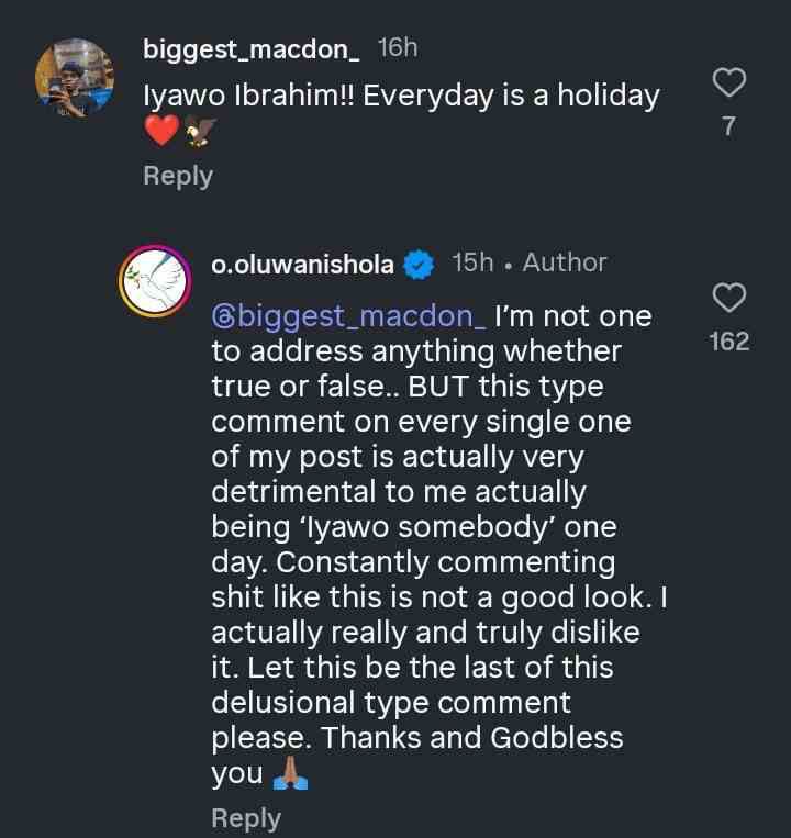 The netizen identified as biggest_macdon_ commented; “Iyawo Ibrahim!! Everyday is a holiday ❤️🦅.”