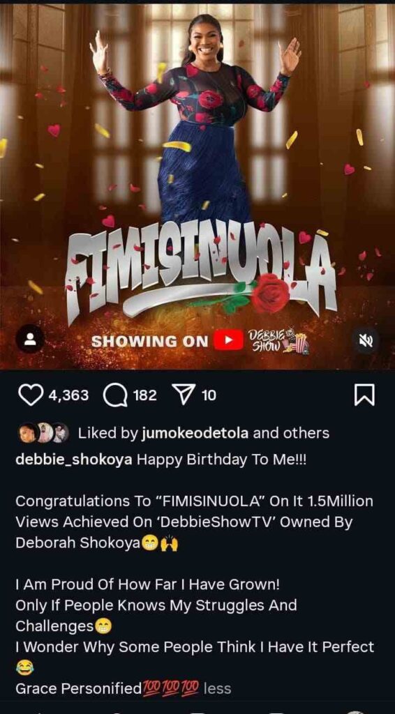 Congratulations To “FIMISINUOLA” On its 1.5Million Views Achieved On ‘Debbie Show TV’ Owned By Deborah Shokoya