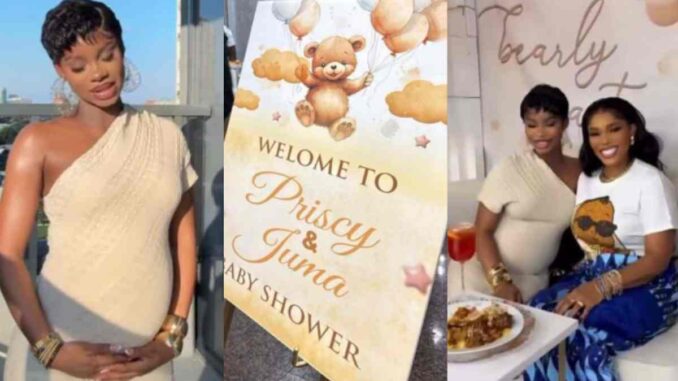 Taking to Snapchat, Priscilla shared heartwarming clips from the intimate celebration organized by her mother, Iyabo Ojo, actress Lola Alao, and a few friends. The video showed Priscilla glowing in her baby shower dress, moments of bonding with her mother, the elegant decor, and fun games that kept the guests entertained throughout the event.