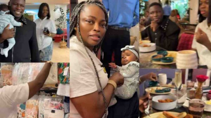 In a video shared on his Instagram page, Kamo captured the moment he, his wife, and their newborn met Funke Akindele at a restaurant. The actress warmly treated them to breakfast and even took their baby daughter shopping, a gesture that deeply touched the family.