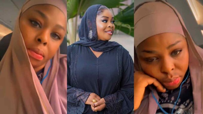 In the video, Famous9ja captured the Nollywood actress aboard an airplane, with the background music of Alhaja Mistura Aderohunmu Asafa, popularly known as Temini Success, playing praises dedicated to those who have performed the Hajj pilgrimage.