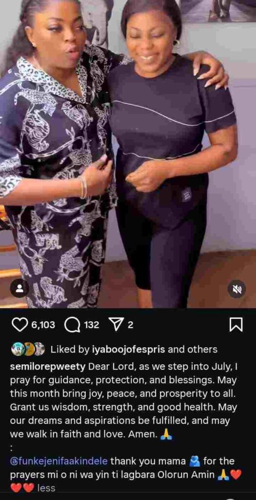 To mark the beginning of a new month, Kudirat shared a heartfelt video on her Instagram page, capturing the moment Funke offered a touching prayer for her.