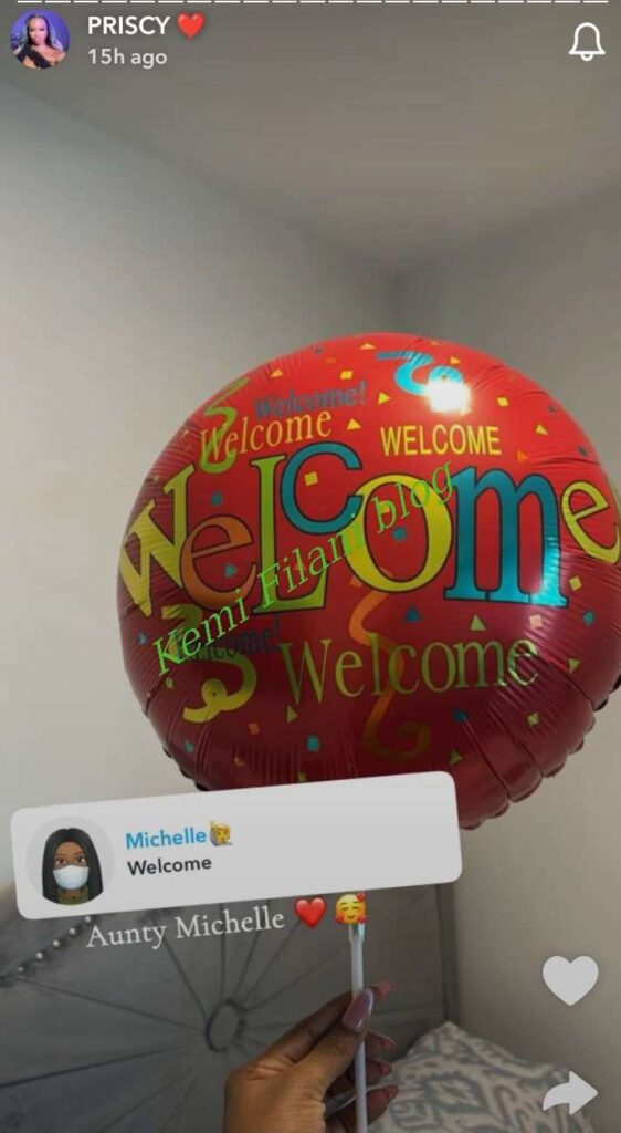Taking to her Snapchat page, Priscilla shared a photo of the beautiful balloons sent by her close friend, Michelle Gentry, as a warm welcome to the country and a show of love and support.