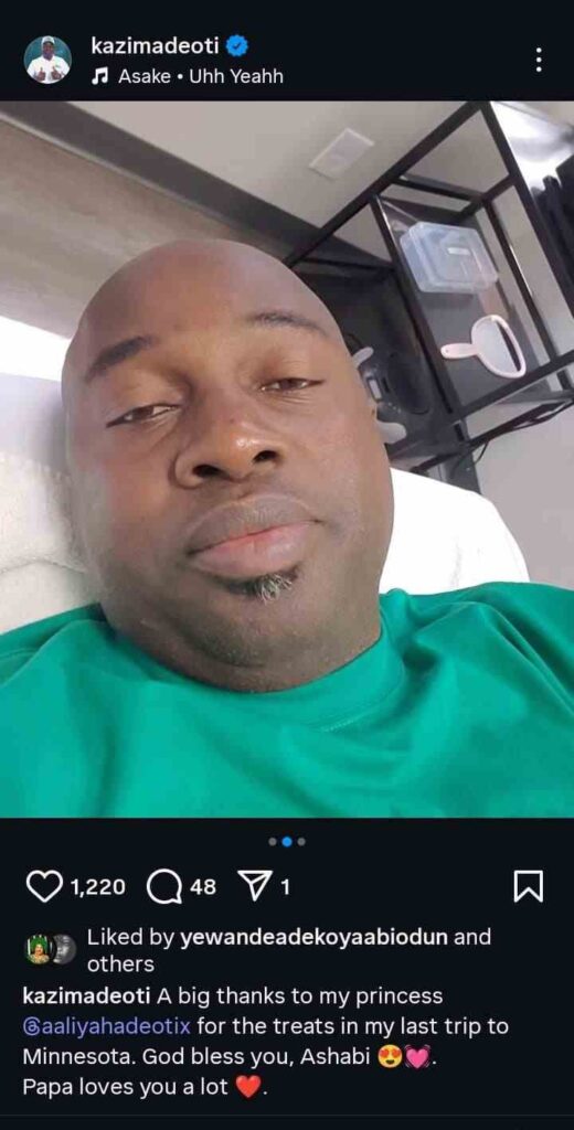 Nigerian filmmaker Kazim Adeoti, the husband of popular actress Mercy Aigbe, has shared a touching message to his daughter after receiving a special gesture from her during his visit to Minnesota.