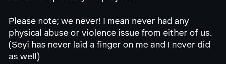 “My Ex husband, Seyi has never laid a finger on me and I never did as well. We never ever had any physical abuse or v!olent issue from either of us. Let us learn to be kind to people. You have no idea what others are going through until they say it”.