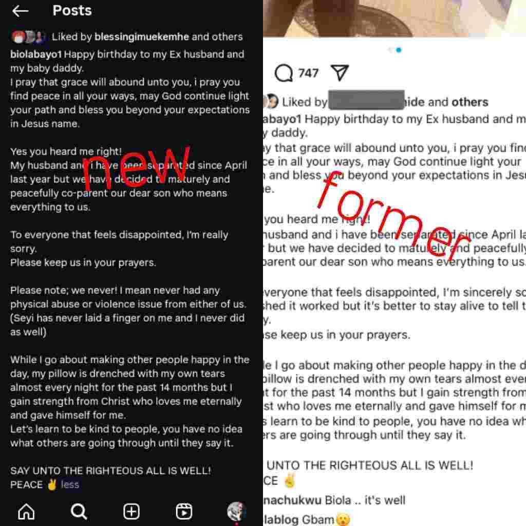Biola Bayo took to her Instagram page to update the post announcing her divorce, making it clear that her ex-husband never laid a finger on her.