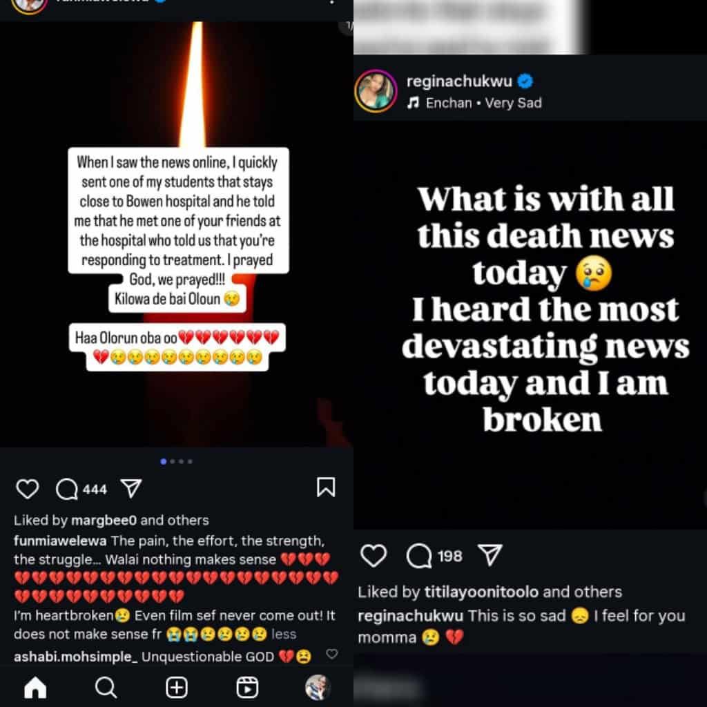 Taking to her Instagram page, Funmi Awelewa shared that upon hearing the news, she sent one of her students who lives near Bowen Hospital to check on him. She was told he was responding to treatment at the time.