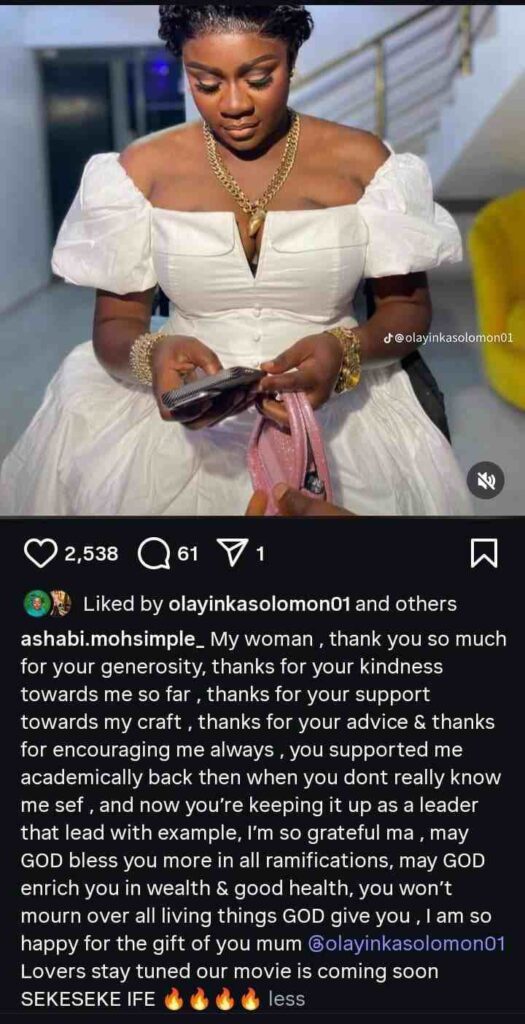 “My woman, thank you so much for your generosity, thanks for your kindness towards me so far, thanks for your support towards my craft, thanks for your advice & thanks for encouraging me always, you supported me academically back then when you dont really know me sef, and now you’re keeping it up as a leader that lead with example, I’m so grateful ma, may GOD bless you more in all ramifications, may GOD enrich you in wealth & good health, you won’t mourn over all living things GOD give you, I am so happy for the gift of you mum @olayinkasolomon01