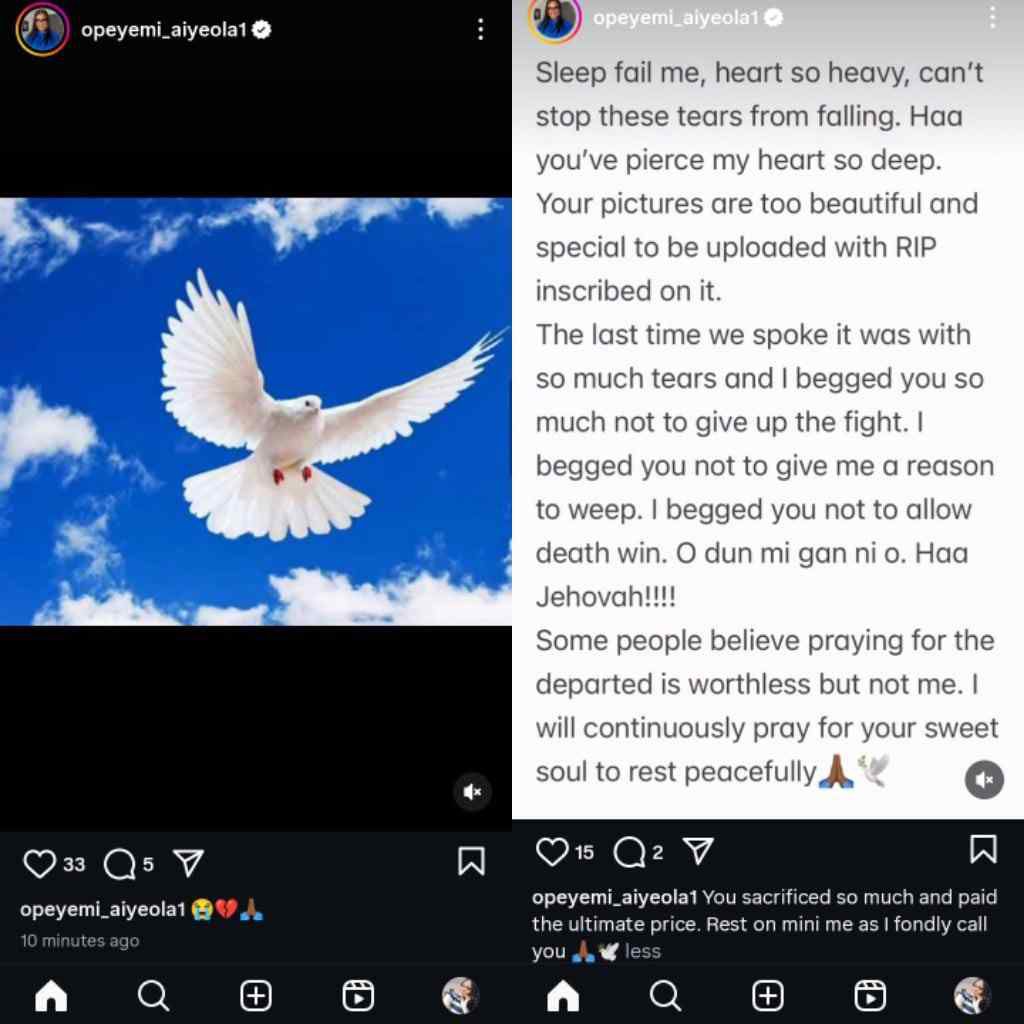In a follow-up post, Opeyemi revealed that she has been unable to sleep, with a heavy heart and tears that refuse to stop. She expressed how the person’s death had pierced her heart so deeply, explaining that their photos are far too beautiful and precious to be shared with an “RIP.”