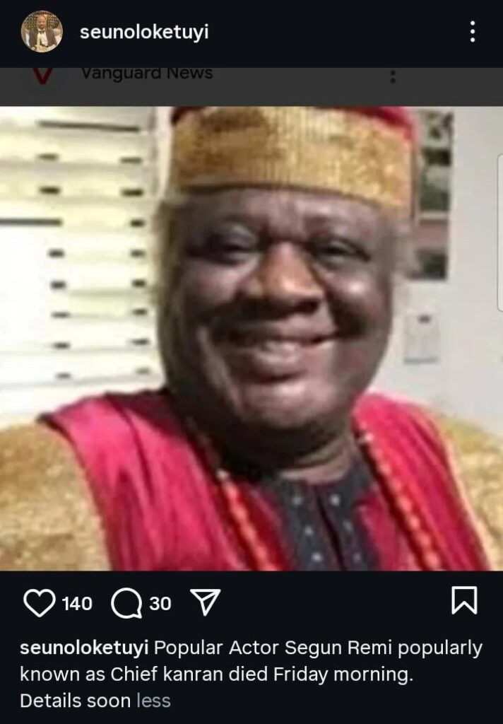 Nollywood veteran Segun Remi, popularly known by his stage name Chief Kanran, has passed away.