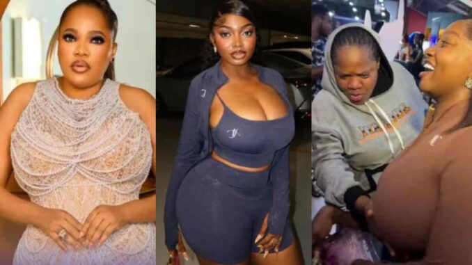 Furthermore, Toyin Abraham stirred reactions online while exchanging pleasantries with Papaya Ex, as she was playfully seen reaching toward the influencer’s chest.